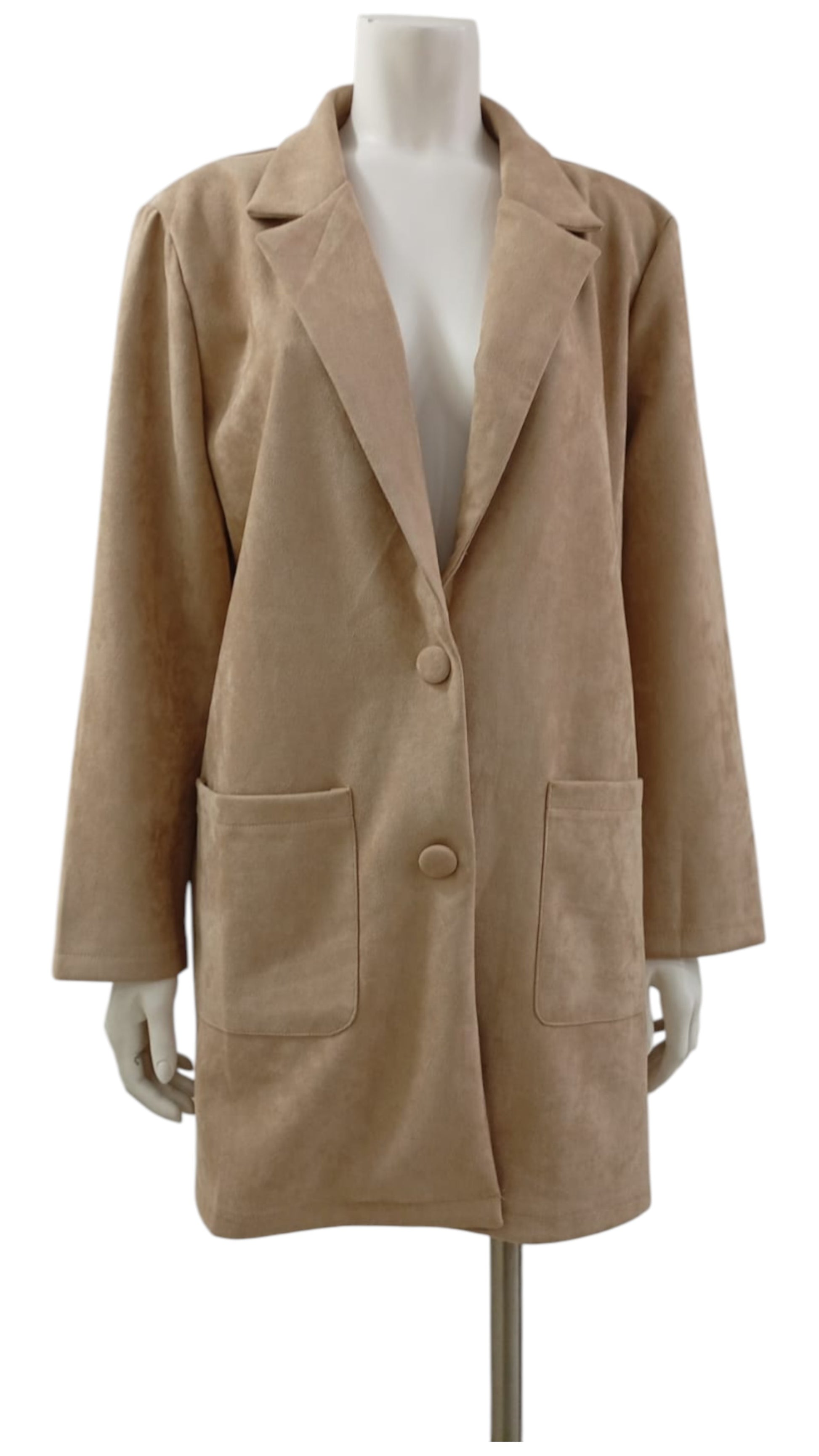 Sofisticación atemporal en cada costura. Este abrigo italiano de gamuza color beige es una prenda versátil y elegante, ideal para elevar cualquier look otoñal o invernal. Su textura suave y su diseño minimalista con dos botones frontales logran un calce refinado y cómodo.