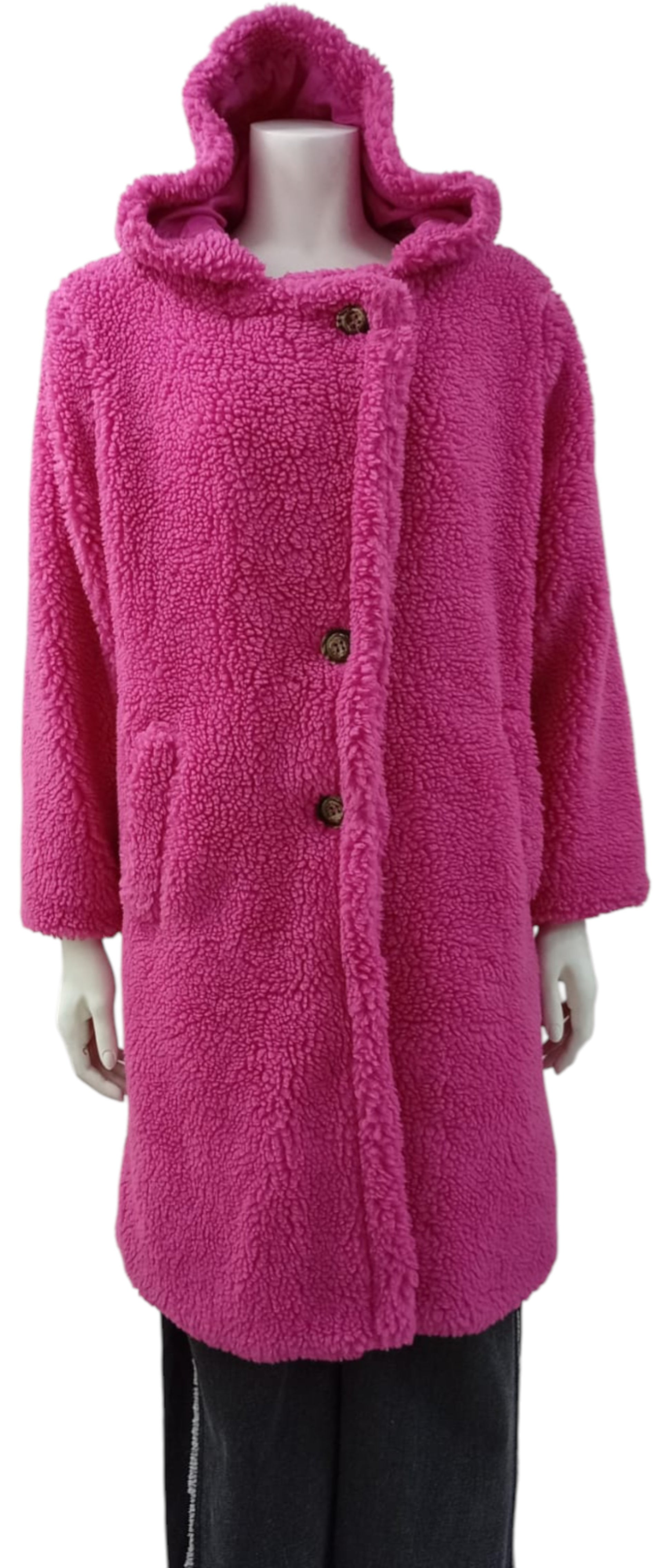 Este abrigo en tono morado profundo es una invitación a enfrentar el frío con estilo. Confeccionado en tela tipo corderito de textura suave y acogedora, incluye capucha y cierre frontal con botones que aportan un aire clásico y funcional.