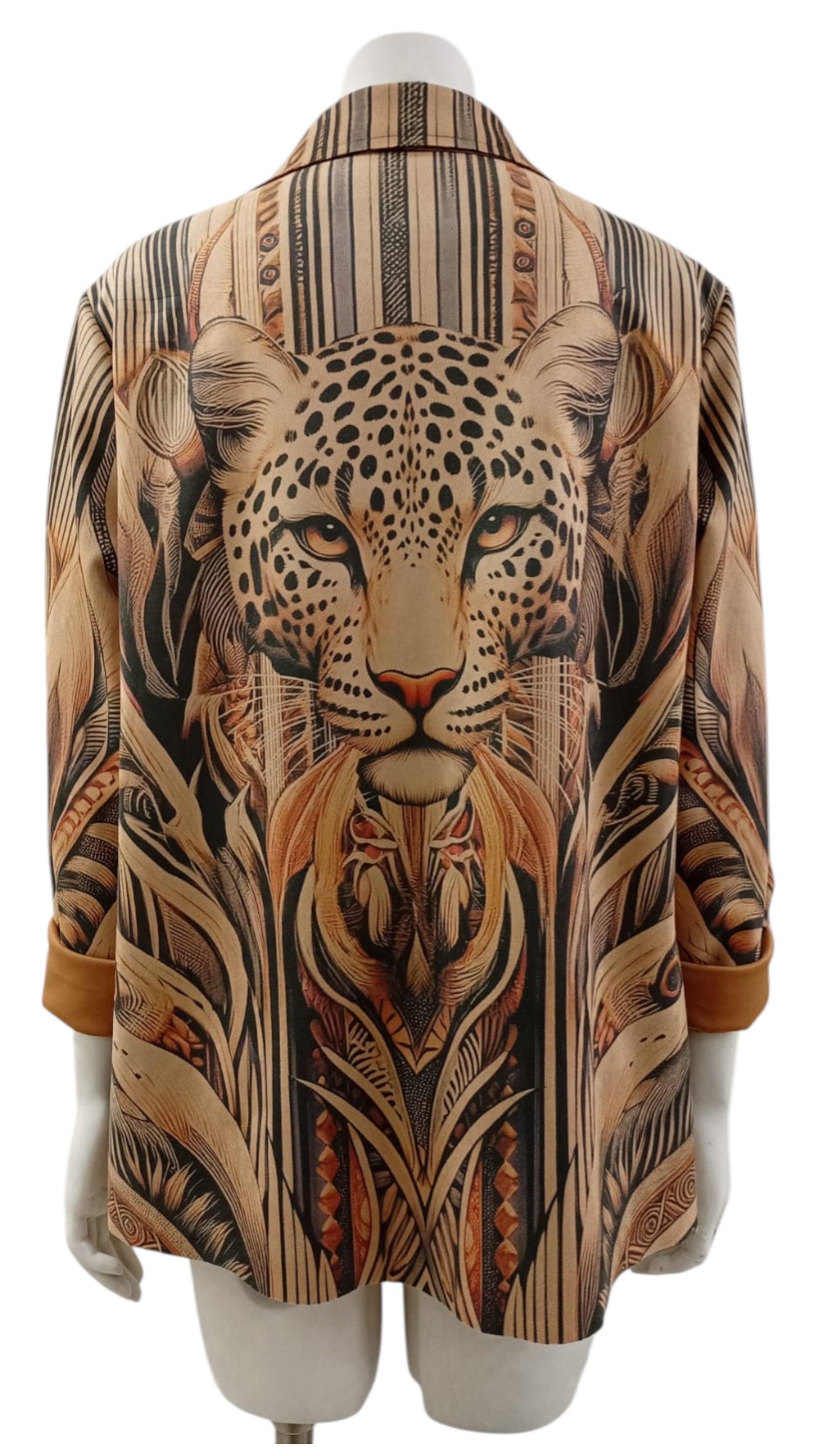 Atrévete a rugir con estilo con este blazer italiano único, que fusiona la elegancia del diseño europeo con la fuerza visual del tigre africano y motivos selváticos. Su estampado audaz transforma cualquier look en una declaración de personalidad y poder.