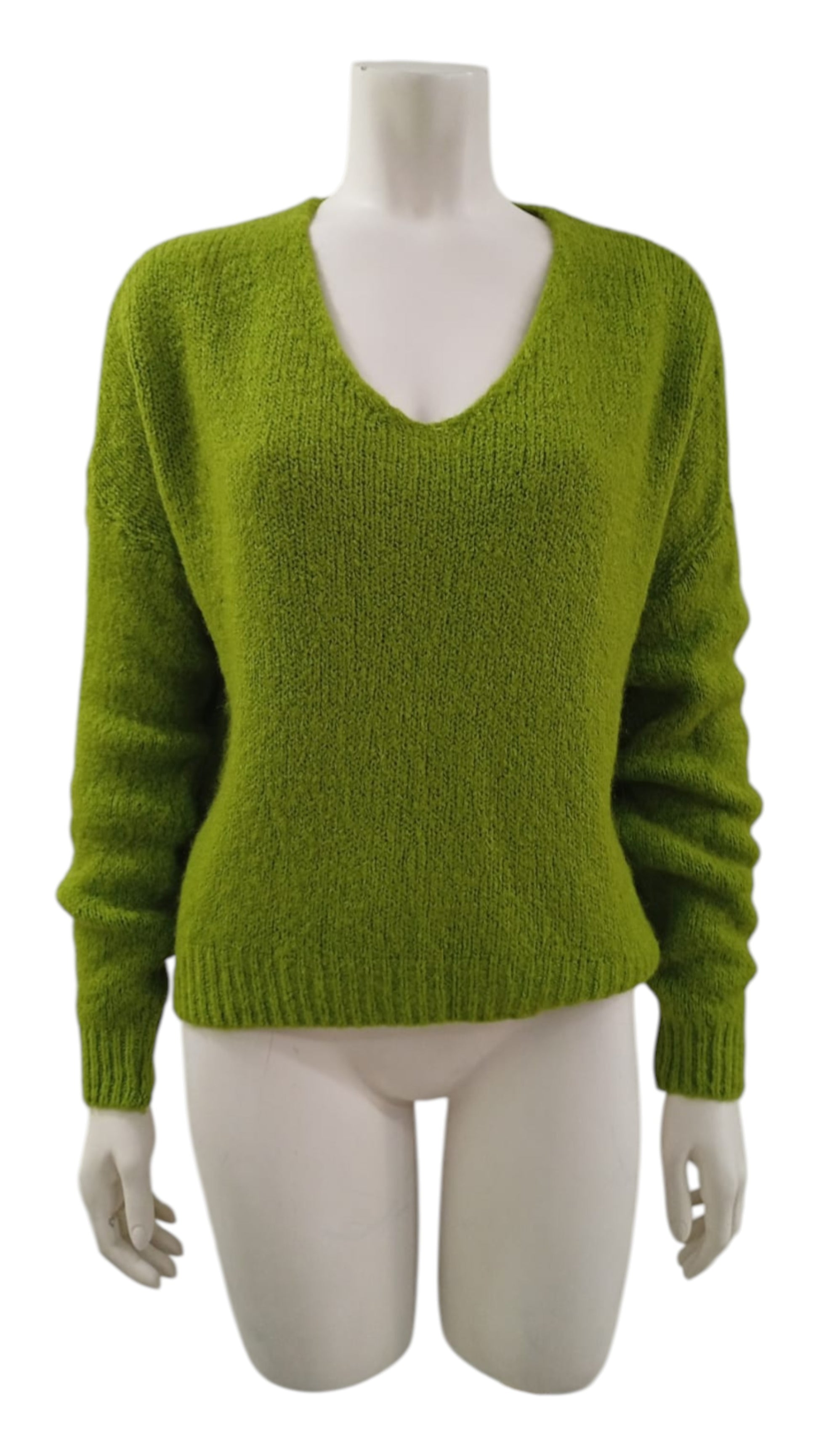 Elegancia y abrigo con sello europeo. Este suéter italiano tejido en lana destaca por su tono verde musgo, sobrio y versátil, ideal para dar un toque natural y sofisticado a tu look. Su escote en V estiliza la silueta, haciendo de esta prenda una opción perfecta tanto para el día a día como para ocasiones más formales.