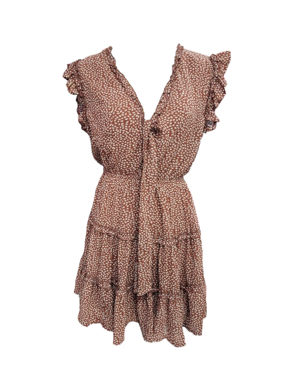 Este vestido estampado de gasa combina ligereza y elegancia en un solo diseño. Su tela fluida y suave brinda un ajuste cómodo y fresco, mientras que las mangas cortas añaden un toque de sofisticación casual. Perfecto para ocasiones de día o para eventos informales, su estampado único le da un aire moderno y lleno de frescura. Ideal para destacar con estilo sin esfuerzo.