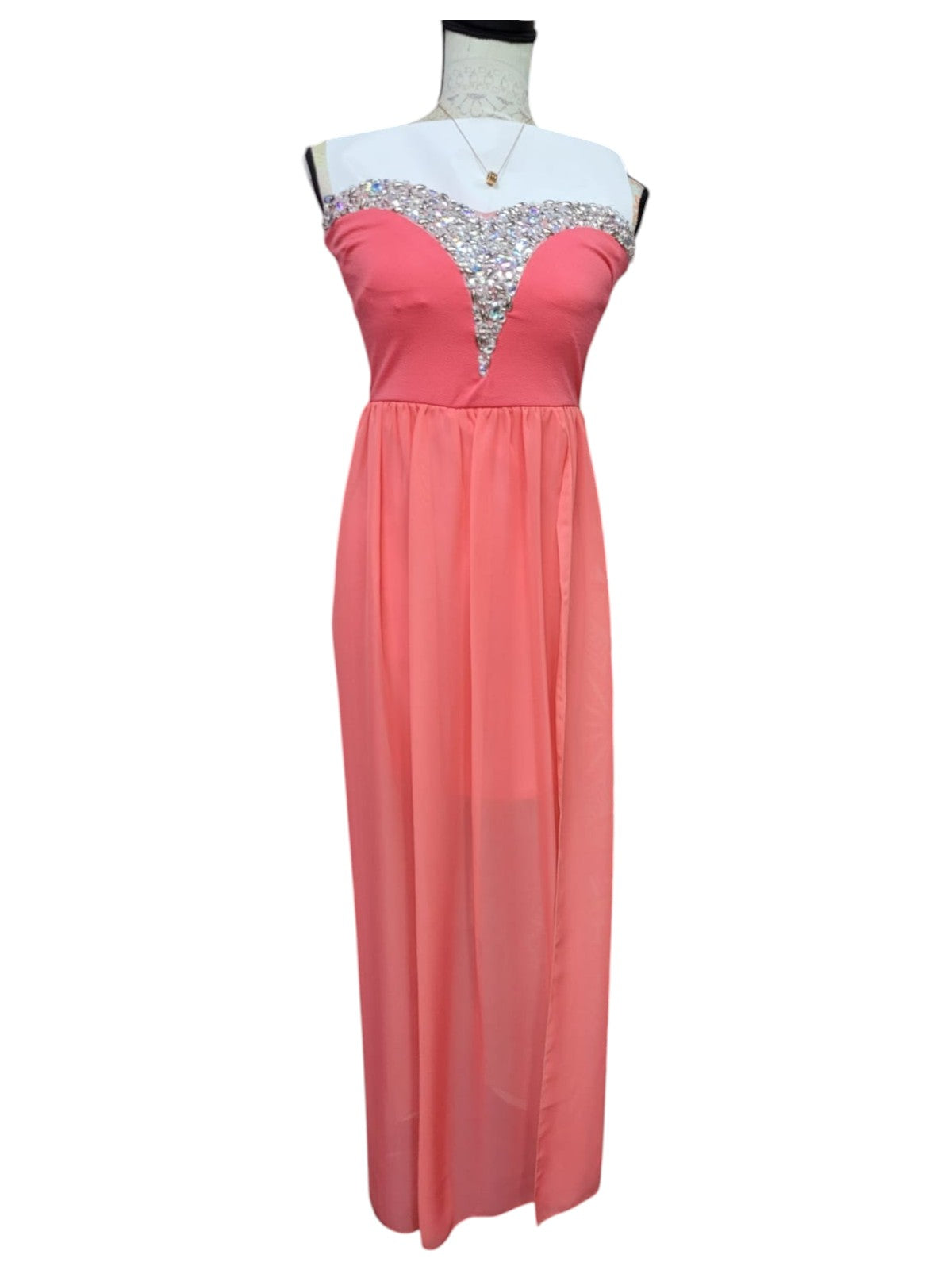 Vestido Fiesta Damasco de Gasa Strapless con Detalle Brillantes al Busto